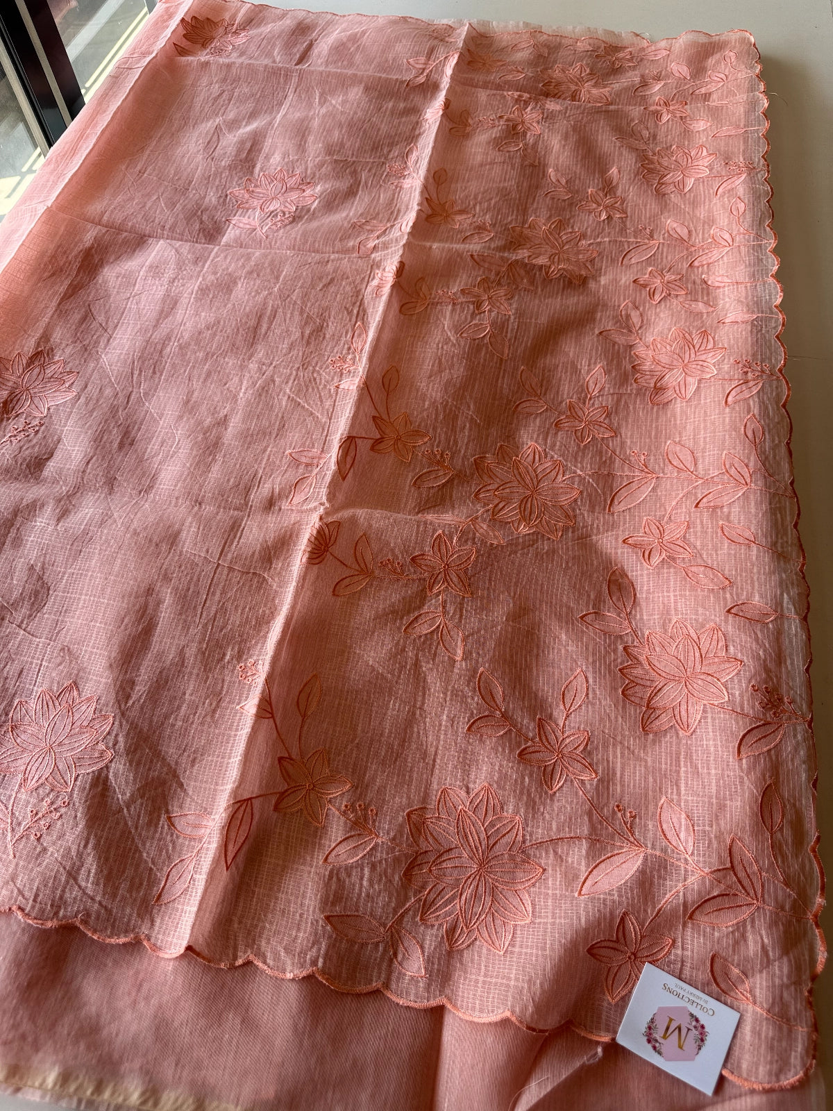 Elegant Net Kotta saree featuring a beautifully designed appliqué pallu and delicately spread appliqué floral motifs across the body. The sheer, flowy fabric drapes effortlessly, adding charm and grace. Paired with a plain Chanderi Kotta blouse piece for a refined and balanced finish, this saree is perfect for festive and occasion wear.